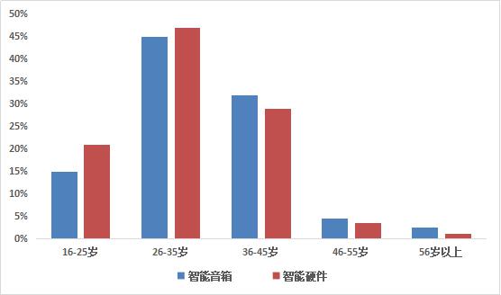 從上述圖表中可以看出,智能音箱用戶(hù)主要集中在26-45歲人群,其中36-45歲人群占比高于智能硬件用戶(hù)。