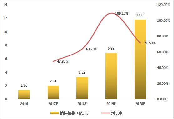 根據(jù)艾媒咨詢(xún)數(shù)據(jù)顯示,2016年中國(guó)智能音箱銷(xiāo)售規(guī)模為1.36億元,預(yù)計(jì)2017年將突破兩億,達(dá)到2.01億,增長(zhǎng)率為47.8%;預(yù)計(jì)到2020年,智能音箱銷(xiāo)售規(guī)模將超過(guò)10億元。目前雖眾多廠商已推出智能音箱產(chǎn)品,但市場(chǎng)總體銷(xiāo)售規(guī)模仍處于較低水平,隨著產(chǎn)品進(jìn)一步優(yōu)化升級(jí)及智能家居的推廣,中國(guó)智能音箱消費(fèi)市場(chǎng)潛力將得到釋放,行業(yè)有望迎來(lái)爆發(fā)式增長(zhǎng)。