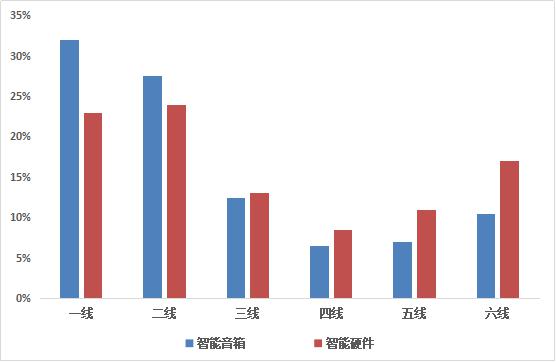 從上述圖表中可以看出,智能音箱用戶(hù)相較于智能硬件用戶(hù)在一二線(xiàn)城市占比更大。