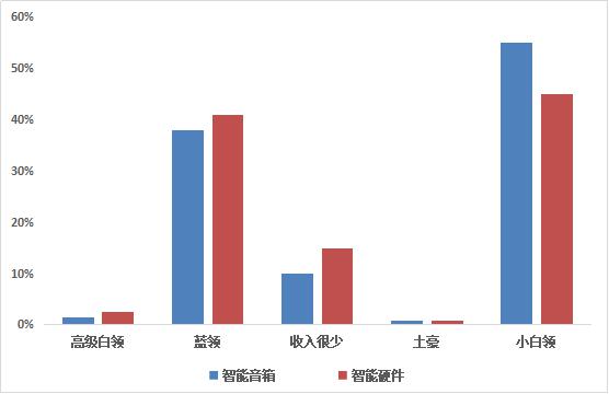 從上述圖表中可以看出,智能音箱用戶(hù)以小白領(lǐng)、藍(lán)領(lǐng)等一定消費(fèi)能力的人群為主,智能音箱小白領(lǐng)用戶(hù)占比更高。