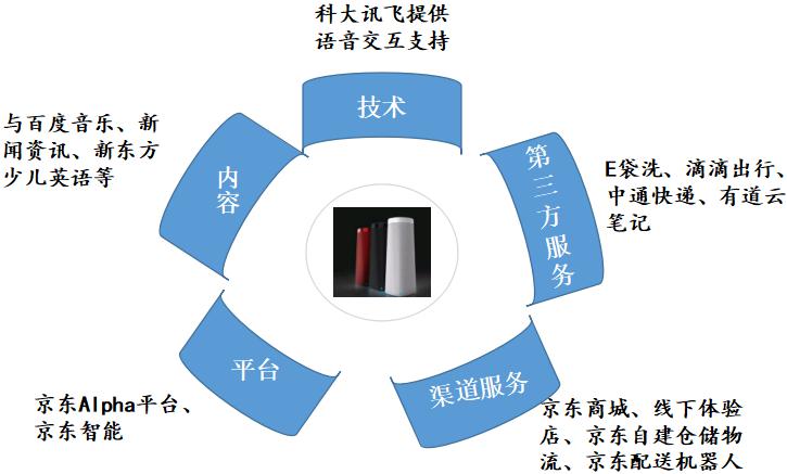 2.通過(guò)強(qiáng)強(qiáng)聯(lián)合的方式,京東通過(guò)電商平臺(tái)優(yōu)勢(shì),整合行業(yè)中的技術(shù)廠商、內(nèi)容廠商及第三方服務(wù)廠商,并發(fā)起“京東智能音頻聯(lián)盟”,向聯(lián)盟內(nèi)成員輸出“JD+智能音頻解決方案”,實(shí)現(xiàn)叮咚音箱產(chǎn)品與優(yōu)質(zhì)內(nèi)容、服務(wù)的結(jié)合。