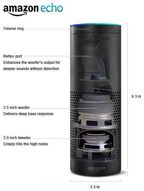以Echo音箱為例,Echo采用封閉式揚(yáng)聲器設(shè)計(jì),高音和低音喇叭上下相對(duì),聲音各個(gè)方向是對(duì)稱(chēng)的,這有利于前端信號(hào)處理,但音效會(huì)受到限制。