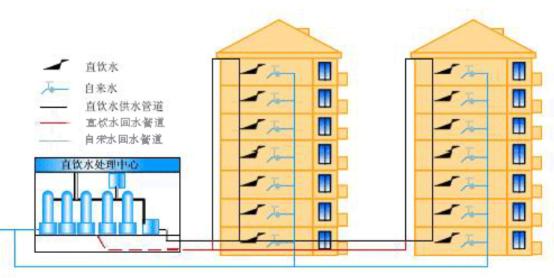 管道直飲水也稱分質(zhì)供水,興建于20世紀90年代中期,主要分布在人口較為集中的學校、醫(yī)院、商務樓宇、較高檔的小區(qū)。分質(zhì)供水是以自來水為原水,把自來水中生活用水和直接飲水區(qū)分開,另設管道直通住戶,實現(xiàn)飲用水和生活用水分質(zhì)、分流,達到直飲的目的。管道直飲水通過中央凈水設備在自來水提供的原水基礎上經(jīng)過再凈化過程提供給人們飲用,通過一些物理過濾、消毒殺菌等深度處理技術(shù)對自來水進行進一步處理,去除水中的有機物、重金屬、細菌、病毒等有害物質(zhì),滿足優(yōu)質(zhì)優(yōu)用、低質(zhì)低用的要求。