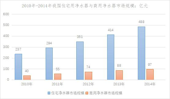 中國凈水器應用市場主要是居民及商業(yè)凈水器市場。2014年國內(nèi)商用凈水器市場達到97億元,居民住宅凈水器市場規(guī)模達到488億元,同時住宅凈水器市場占比明顯大于商用凈水器市場。