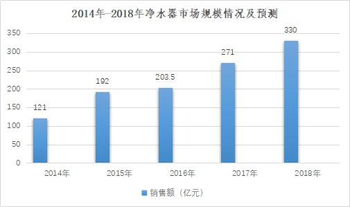 我國凈水器市場尚未完全開發(fā),目前我國凈水器市場覆蓋率僅5%,而韓國的市場覆蓋率高達95%。這其中,蘊含著巨大的商機,未來凈水器市場可以發(fā)展成上千億乃至更多的產(chǎn)業(yè)。根據(jù)中商產(chǎn)業(yè)研究院發(fā)布的《2018-2023年中國凈水器市場前景及投資機會研究報告》數(shù)據(jù)顯示,2016年中國凈水器銷售規(guī)模為203.5億元,同比增長40.6%;2017年中國凈水器市場規(guī)模達271億元,同比增長33.2%,其中線上可達213億元,線下可達58億元。同時,在2018年中國凈水器銷售規(guī)?;?qū)⑼黄?30億元。