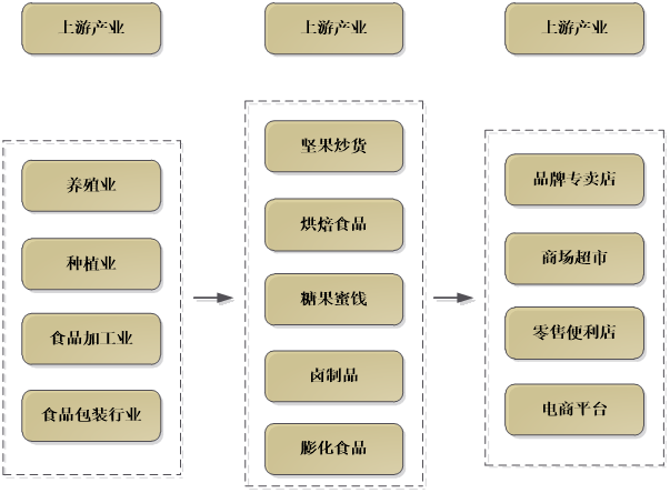 休閑食品行業(yè)的上游行業(yè)包括傳統農業(yè)如種植業(yè)、養(yǎng)殖業(yè)、,食品添加劑、食品包裝行業(yè)。行業(yè)的下游主要是銷售環(huán)節(jié),通過多種渠道如大型商超、直營店、經銷商等進行銷售,直面產品終端消費者。