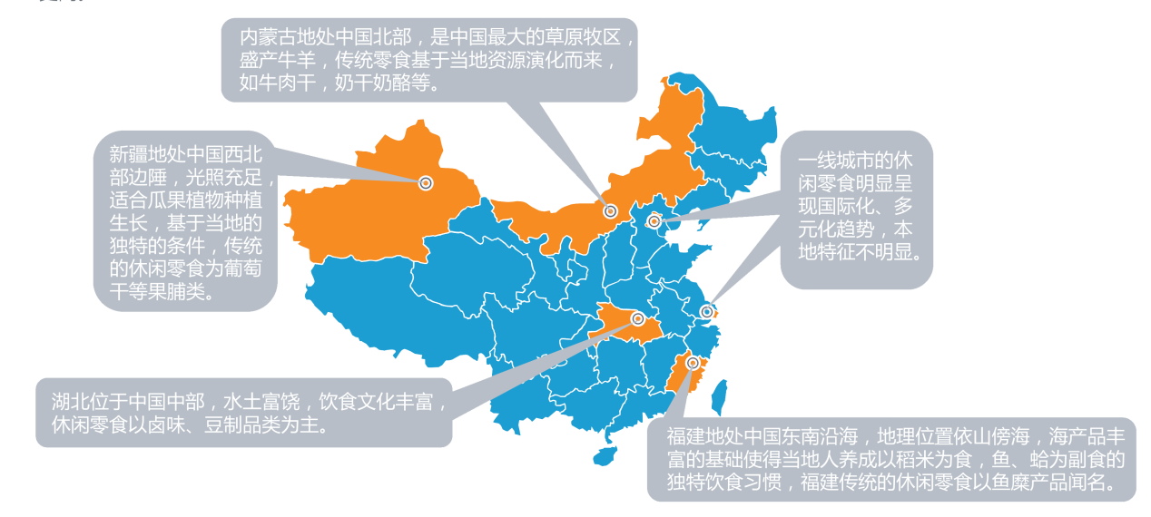 休閑食品的生產與農業(yè)資源緊密相連。不同的地域有著截然不同的農業(yè)資源,產業(yè)集中度較高,由此形成了眾多具備獨特資源優(yōu)勢的休閑食品品類,引領著中國休閑食品的發(fā)展潮流。目前,已經興起了諸如福建軍團、安徽炒貨軍團、湖南辣食品、河南速凍食品軍團等一大批優(yōu)秀的休閑食品企業(yè)。