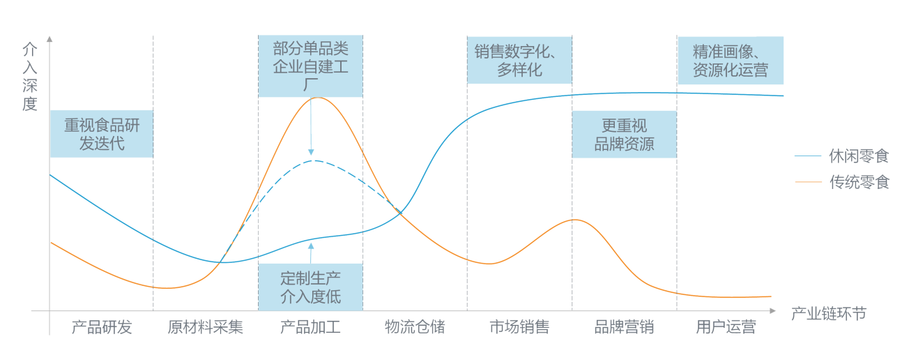 目前,市場上對休閑零食的劃分有五至十二個品類,每個品類之中又包含若干子品類,導致休閑零食的市場碎片化嚴重;傳統食品企業(yè)跨品類經營意味著重新購置、配置一條生產線,成本巨大;同時,部分休閑零食企業(yè)采用對外合作定制生產策略,僅發(fā)力于食品研發(fā)環(huán)節(jié),一定程度上改進了以往重資產企業(yè)跨品類難度大的問題,孕生了平臺型、多品類經營新業(yè)態(tài)。