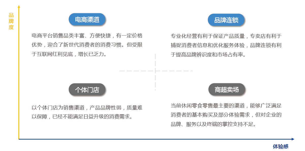 休閑零食的渠道陣營主要有四大類:傳統的個體門店和商超賣場,新興的品牌連鎖和電商渠道。在新零售浪潮的沖擊下,四大陣營此消彼長,個體門店的市場份額不斷縮減,商超賣場的渠道影響力也將減弱,品牌連鎖和電商渠道將成為未來休閑零食新消費的主流渠道。