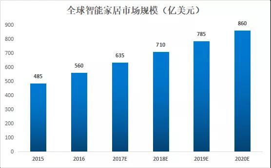 根據(jù)GFK統(tǒng)計(jì),全球智能家居市場規(guī)模在2015年達(dá)485億美元,隨后增速逐漸趨緩,預(yù)計(jì)仍然維持每年約80億美元的增速。預(yù)計(jì)2018年市場規(guī)模將達(dá)到710億美元。