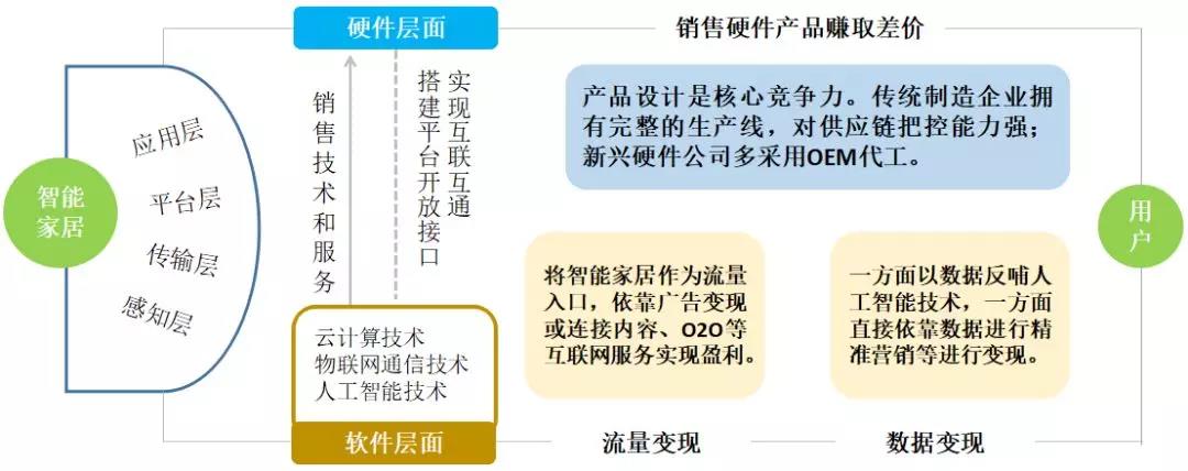 將智能家居劃分為硬件和軟件兩個層面,其中硬件對應(yīng)于智能家居的應(yīng)用層,軟件對于智能家居的平臺層、傳輸層和感知層。硬件產(chǎn)品的品牌方專注于產(chǎn)品側(cè)的設(shè)計(jì)和制造,向終端用戶提供的是智能家居的物理屬性,通過銷售硬件賺取差價(jià)實(shí)現(xiàn)盈利。針對智能家用產(chǎn)品的云計(jì)算、物聯(lián)網(wǎng)通信和人工智能三項(xiàng)核心技術(shù),技術(shù)供應(yīng)商通常會提供其中的一項(xiàng)或多項(xiàng)能力。他們既可以選擇直接通過向硬件廠商銷售技術(shù)和服務(wù)變現(xiàn),也可以選擇以硬件產(chǎn)品連接到海量的終端用戶,利用獲取到的用戶流量和數(shù)據(jù),通過面向消費(fèi)者的互聯(lián)網(wǎng)服務(wù)和面向企業(yè)的數(shù)據(jù)服務(wù)進(jìn)行變現(xiàn)。