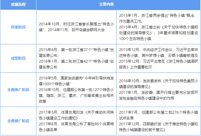 改革開放以來,我國特色小鎮(zhèn)經歷了三個發(fā)展階段:第一階段即探索階段,2014年浙江省省長李強首提“特色小鎮(zhèn)”;第二階段為成型階段,習近平在《浙江特色小鎮(zhèn)調研報告》上做了重要批示;第三階段為全面推廣階段,這個階段特點為國家發(fā)布引導政策,隨后地方政策密集出臺,全國各地特色小鎮(zhèn)建設如火如荼。