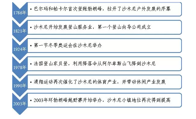 沙木尼的作為特色小鎮(zhèn)的最初起源,來自1786年8月當?shù)孬C人巴爾瑪和醫(yī)生帕卡爾兩人首次登上勃朗峰;1821年開始,沙木尼開始發(fā)展登山服務業(yè),小鎮(zhèn)內34名的本地向導組成了一個向導公司;1924年第一屆冬季奧運會在沙木尼舉辦,世界性的滑雪教練訓練中心也在這里落戶。至此,沙木尼的特色小鎮(zhèn)地位已經基本