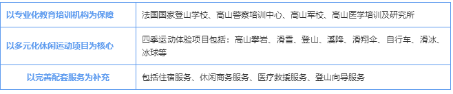 在法國,登山向導對顧客的行為承擔法律責任,這些以技術高超、經驗豐富,責任感強而著稱的向導們在全世界都享有盛譽。國立登山滑雪學校開設的項目有登山向導、滑雪教練、高山協(xié)作、救援、滑翔傘教練。學校設備齊全,配有六個可容納20至80人的會議室、一個可容納220人且配有錄像投影機的階梯教室、一棟配有132個標間的宿舍樓、一個自助餐中心、一個健身房、一個器材室及其它科研場所。因為ENSA的存在,沙木尼成為全球登山標準的定制者,完善的培訓和卓越的服務成為其登山產業(yè)發(fā)展的護城河。