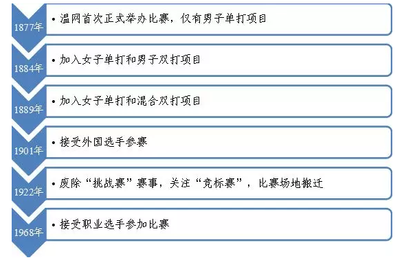 溫網于1877年首次于全英草地網球和門球俱樂部管理之下在溫布爾登Worpl路附近的一塊場地舉行,當時僅有男子單打比賽。1884年,全英俱樂部增加了女子單打和男子雙打比賽,女子雙打和混合雙打則在1889年加入。1922年比賽搬遷到到了如今的Church路場地。如同其他3項“大滿貫”賽事,溫布爾登在1968年網球公開時代到來之前,只對頂級的業(yè)余選手開放。而之后,溫網是所有職業(yè)選手的圣地。