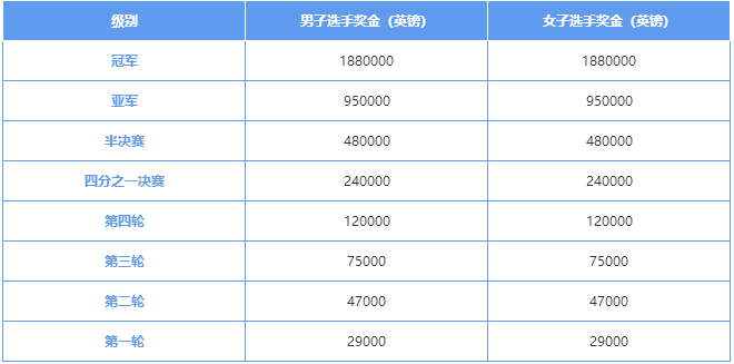 溫網不斷攀升的獎金也是吸引選手參賽的一大因素。1984年,溫網男子單打冠軍獎金為10萬英鎊,女子單打冠軍為9萬英鎊;1985年男單冠軍為13萬英鎊;1987年男單冠軍獎金為15.5萬英鎊;1991年男單冠軍獲24萬英鎊,女單冠軍獲21.6萬英鎊,甚至第1輪遭淘汰選手也可獲得一筆獎金,男子3600英鎊,女子2790英鎊。如今,溫網已經實現(xiàn)了男女運動員獎金持平政策,每年共有2700萬磅獎金,已經超過美網(2600萬磅)、澳網(2300萬磅)、法網(2200萬磅)成為獎金最多的公開賽。