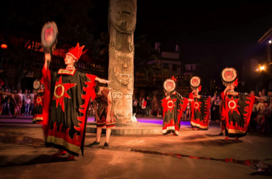 “彝鄉(xiāng)戀歌”是偉光匯通打造的一項以“天天長街宴、夜夜火把節(jié)”為主題的彝族原生態(tài)歌舞伴餐類旅游產品。通過連通的環(huán)形水上吊腳樓這一特殊用餐環(huán)境,“彝家八大碗”這一特色餐品,營造和再現(xiàn)了彝族人民擺設長街宴同族共聚、誠摯待客的餐飲文化。而在品嘗彝家美食之余,中央水榭舞臺的表演更是精彩紛呈——跳菜、敬酒歌、服飾展、猜新娘互動等等,讓游客在享受美食的同時,感受原汁原味的彝族風情。