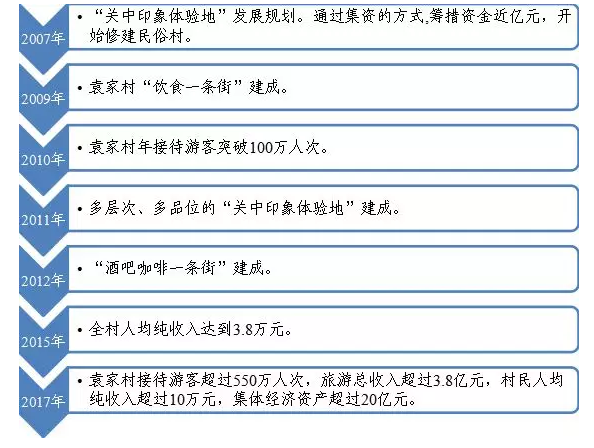 袁家村從2007年開始由村委書記帶領發(fā)展鄉(xiāng)村旅游,通過將關中的特有民俗小吃、技藝等與現(xiàn)代文化創(chuàng)意、休閑生活方式相結合,形成了現(xiàn)在的年游客量過百萬、收入過億的關中民俗特色文化旅游小鎮(zhèn)。