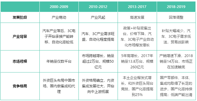 中國汽車產(chǎn)業(yè)制造水平相對(duì)落后,3C電子開始承接第三次全球產(chǎn)能轉(zhuǎn)移(日韓臺(tái)到中國),自動(dòng)化程度較低。外資機(jī)器人巨頭普遍2000年前后進(jìn)入中國,工業(yè)機(jī)器人年銷售數(shù)千臺(tái),基本都是外資品牌,主要用于汽車行業(yè)。國內(nèi)企業(yè)以做外資的系統(tǒng)集成和代理商為主,極少數(shù)企業(yè)如沈陽新松有自研機(jī)器人本體。