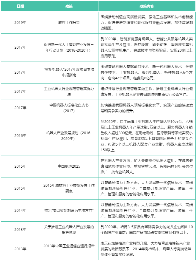 智能制造是“中國制造2025”發(fā)展規(guī)劃的重要發(fā)展方向,是未來制造業(yè)發(fā)展的必然趨勢,工業(yè)機(jī)器人是智能制造的關(guān)鍵設(shè)備,行業(yè)發(fā)展?jié)摿薮?。近年來,國家出臺(tái)了一系列的政策支持和鼓勵(lì)中國工業(yè)機(jī)器人行業(yè)的發(fā)展。根據(jù)2016年國務(wù)院發(fā)布的《機(jī)器人產(chǎn)業(yè)發(fā)展規(guī)劃(2016-2020年)》,到2020年,我國工業(yè)機(jī)器人產(chǎn)量達(dá)到10萬臺(tái),六軸及以上工業(yè)機(jī)器人年產(chǎn)量達(dá)到5萬臺(tái)以上;培育3家以上具有國際競爭力的龍頭企業(yè);機(jī)器人密度達(dá)到150以上。
