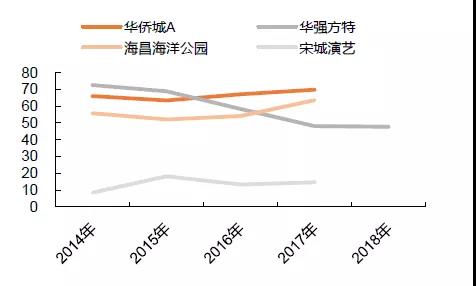 華僑城和海昌海洋公園均有地產(chǎn)開發(fā)業(yè)務(wù),其中華僑城以房地產(chǎn)收入為主,2018年上半年旅游業(yè)務(wù)收入占比32%;海昌海洋公園地產(chǎn)收入占比很低,且近年來聚焦主題公園業(yè)務(wù),地產(chǎn)收入占比明顯下降,從2010年的52%降低到2018年上半年的7%,主題公園營運(yùn)收入占比達(dá)93%。