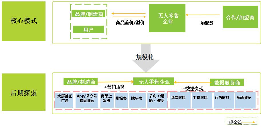 無(wú)人零售企業(yè)收入來(lái)源以銷售商品賺取差價(jià)為主,并且通過(guò)規(guī)?;岣咦h價(jià)能力降低采購(gòu)成本。此外,從加盟商獲取加盟費(fèi)用的商業(yè)模式也已經(jīng)開始推行。無(wú)人零售發(fā)展至中后期,企業(yè)數(shù)據(jù)更為龐大,其盈利模式將隨之產(chǎn)生更多的想象空間,以互聯(lián)網(wǎng)思路開展?fàn)I銷服務(wù)、數(shù)據(jù)變現(xiàn)等都是比較成熟的可參考模式。
