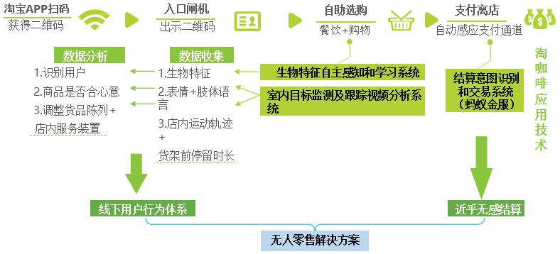 2017年7月阿里巴巴在淘寶造物節(jié)上推出無(wú)人便利店淘咖啡。淘咖啡經(jīng)營(yíng)面積約200平米,分成超市區(qū)(無(wú)店員)和餐飲點(diǎn)單區(qū)(有少量店員),可一次性容納客流50人左右。消費(fèi)者通過(guò)手機(jī)淘寶 APP 掃碼進(jìn)店,選購(gòu)?fù)瓿珊笮柰ㄟ^(guò)兩道結(jié)算門,當(dāng)?shù)谝坏篱T感應(yīng)到消費(fèi)者的離店需求時(shí)即會(huì)開啟,消費(fèi)者走出第一道門后,系統(tǒng)會(huì)自動(dòng)對(duì)所購(gòu)買商品進(jìn)行識(shí)別與結(jié)算,結(jié)算完成后第二道門自動(dòng)打開,消費(fèi)者離店。
