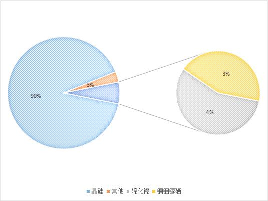 晶硅太陽能電池約占市場份額90%;薄膜太陽能電池占市場份額約10%,其中碲化鎘市場份額約4%,銅銦鎵硒約占市場份額3%。其他薄膜電池如軍工領(lǐng)域應(yīng)用較多的砷化鎵、目前無法規(guī)?;拟}鈦礦等太陽能電池占市場份額約3%。碲化鎘目前90%的市場由美國薄膜電池制造商First Solar壟斷。