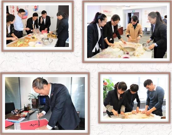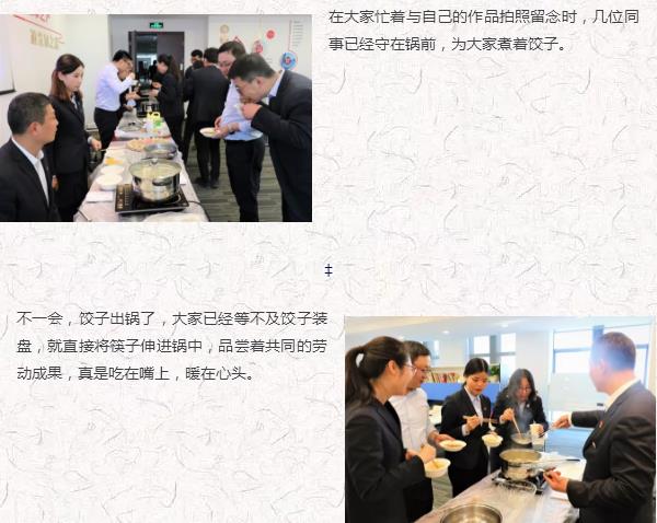大家分成“愛吃餃子”“會做餃子”“多彩生活”和“幸福花兒”四個組合,展開了包餃子比賽。只見他們熟練的搟面皮、放餡料、捏餃子,十指翻飛之間,剁餡聲、歡笑聲、音樂聲,交織在一起,每個人臉上都洋溢著燦爛的笑容,公司里充滿了歡聲笑語,匯聚成了一片歡樂的海洋。